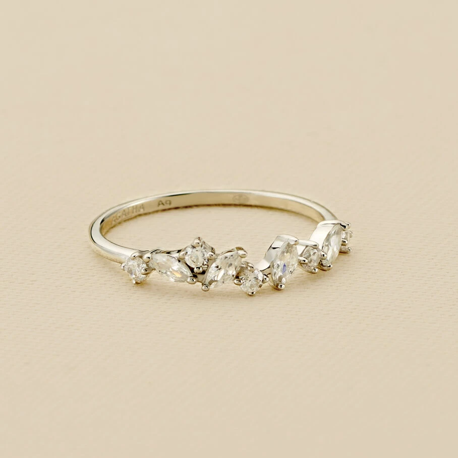 Bague fine, en argent véritable, sertie d’oxydes de zirconium et d’oxydes de forme marquise