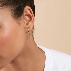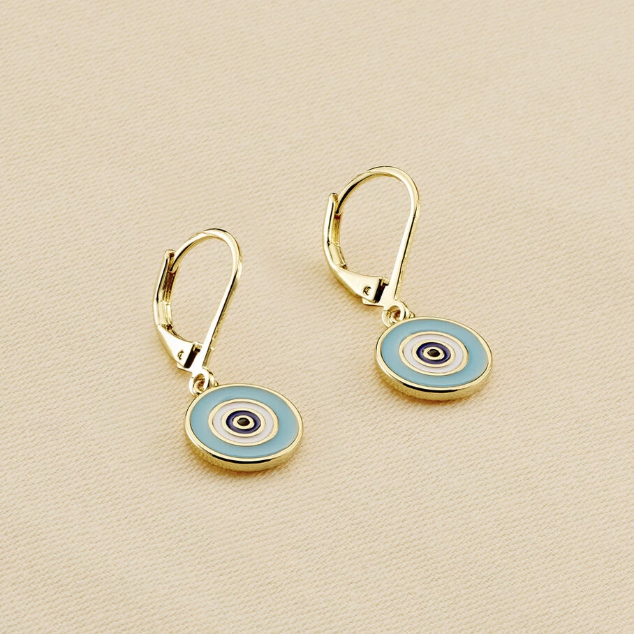 Boucles d’oreilles dormeuses, en laiton doré à l’or fin, avec un œil turc émaillé centré d’un oxyde de zirconium