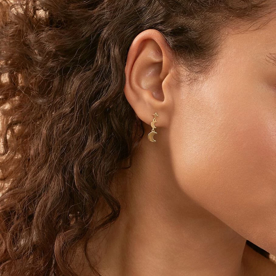 Boucles d’oreilles mi-longues et asymétriques, en argent doré 750/1000, dont les pendentifs représentent le cycle lunaire