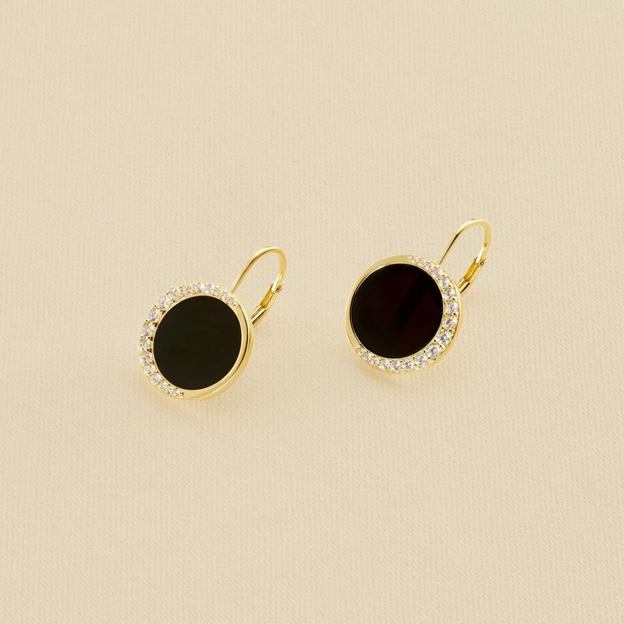 Boucles d’oreilles dormeuses, en argent vĂ©ritable dorĂ© 750/1000, ornĂ©es d’une pastille en onyx et d’un motif lune serti d’oxydes de zirconium