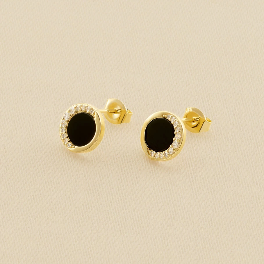 Boucles d’oreilles puces, en argent vĂ©ritable dorĂ© 750/1000, ornĂ©es d’une pastille en onyx et d’un motif lune serti d’oxydes de zirconium