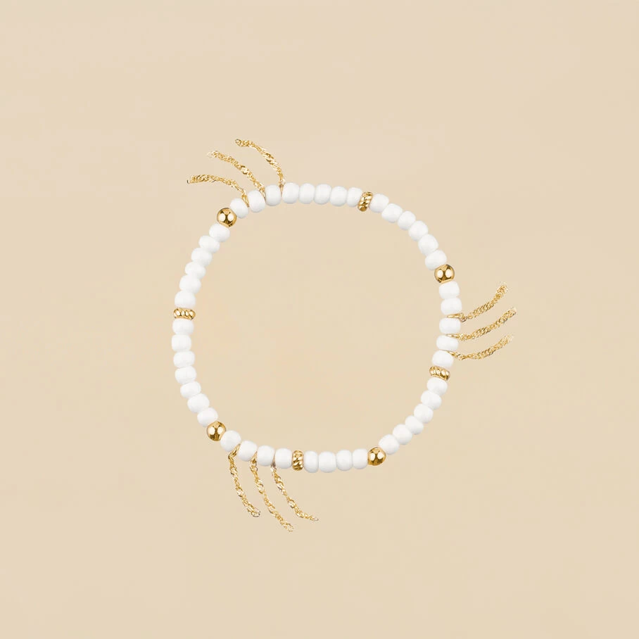 Bracelet elastique, en laiton doré 750/1000, perles de verre enfilées et pompons de chaines