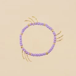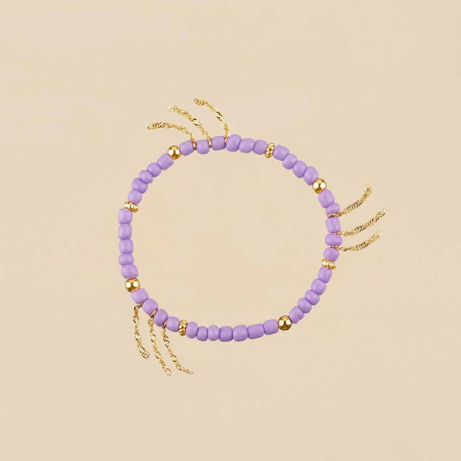 Bracelet elastique, en laiton doré 750/1000, perles de verre enfilées et pompons de chaines