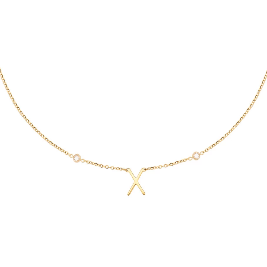 Collier fin composé de la lettre X et de deux oxydes de zirconium. Longueur: 42cm