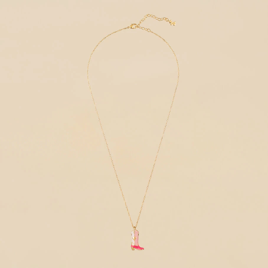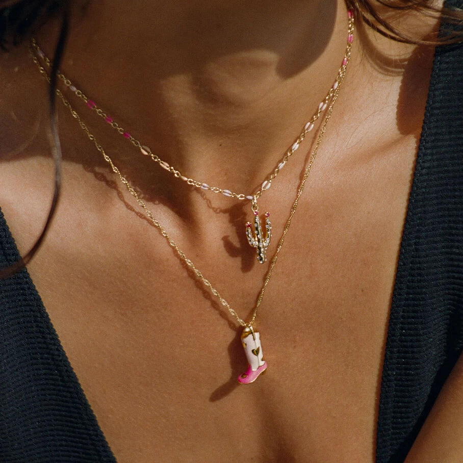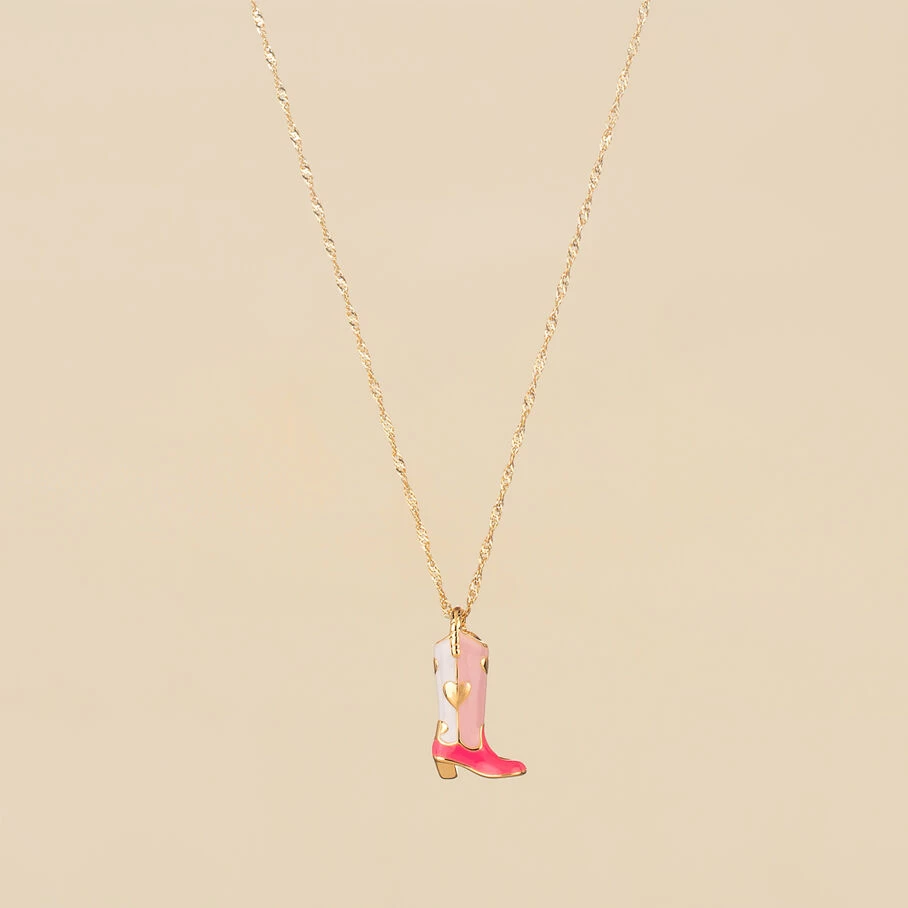 Collier mi-long, en laiton doré 750/1000, botte émaillée sur chaine