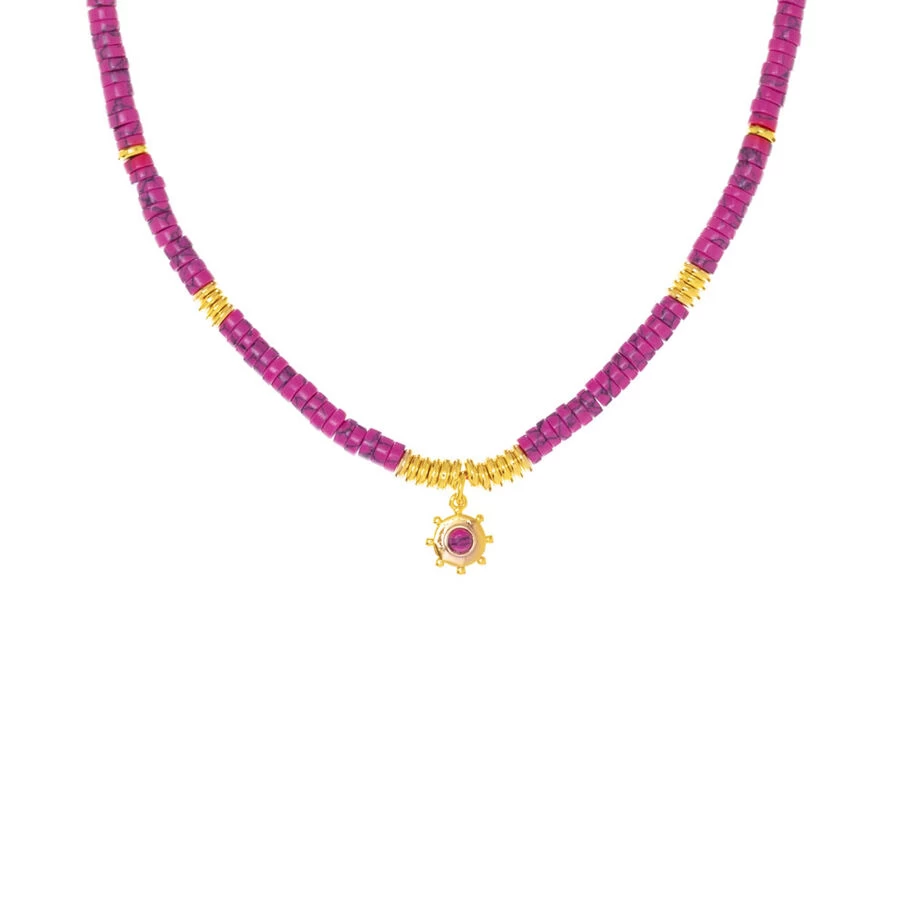 Collier court en laiton doré 750/1000 avec des perles heishi et une pampille ‘soleil’ ornée d’un cabochon de pierre fine