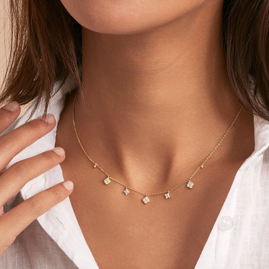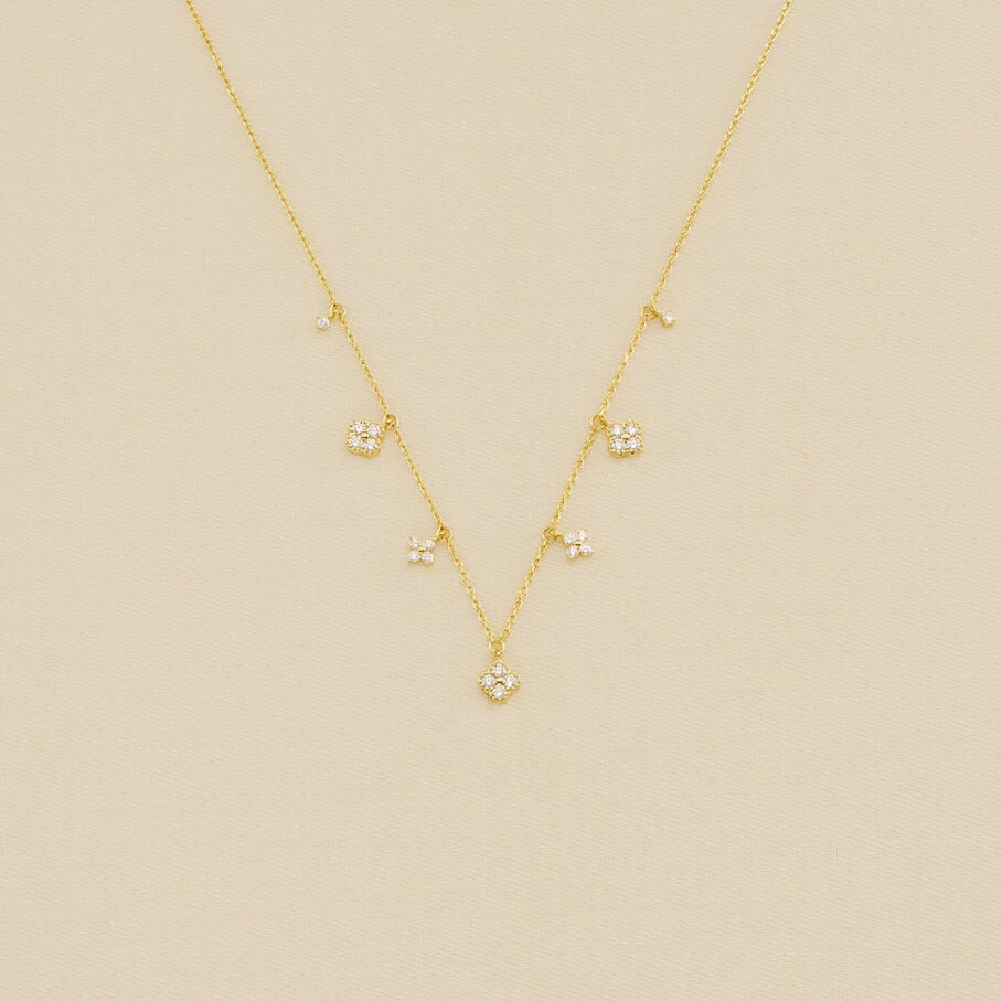 Collier court, en argent véritable doré 750/1000, avec des fleurs d’oxydes de zirconium en pampille et un fin graineti sur le pourtour