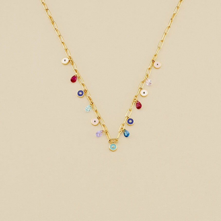 Choker, en laiton doré à l’or fin, avec des perles d’oeils turcs plats et des oxydes percés en pampilles sur chaine rectangle