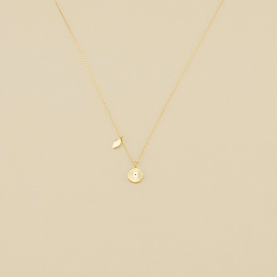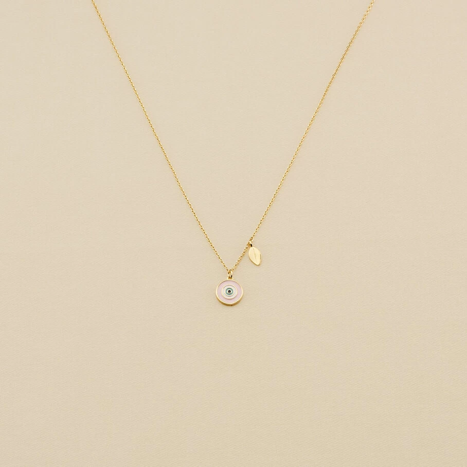 Collier court, en laiton doré à l’or fin, avec un œil turc et un coquillage sur chaine en pendentifs