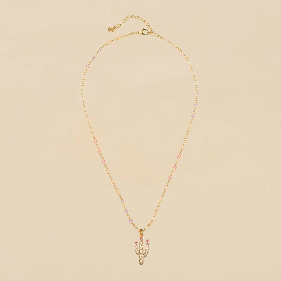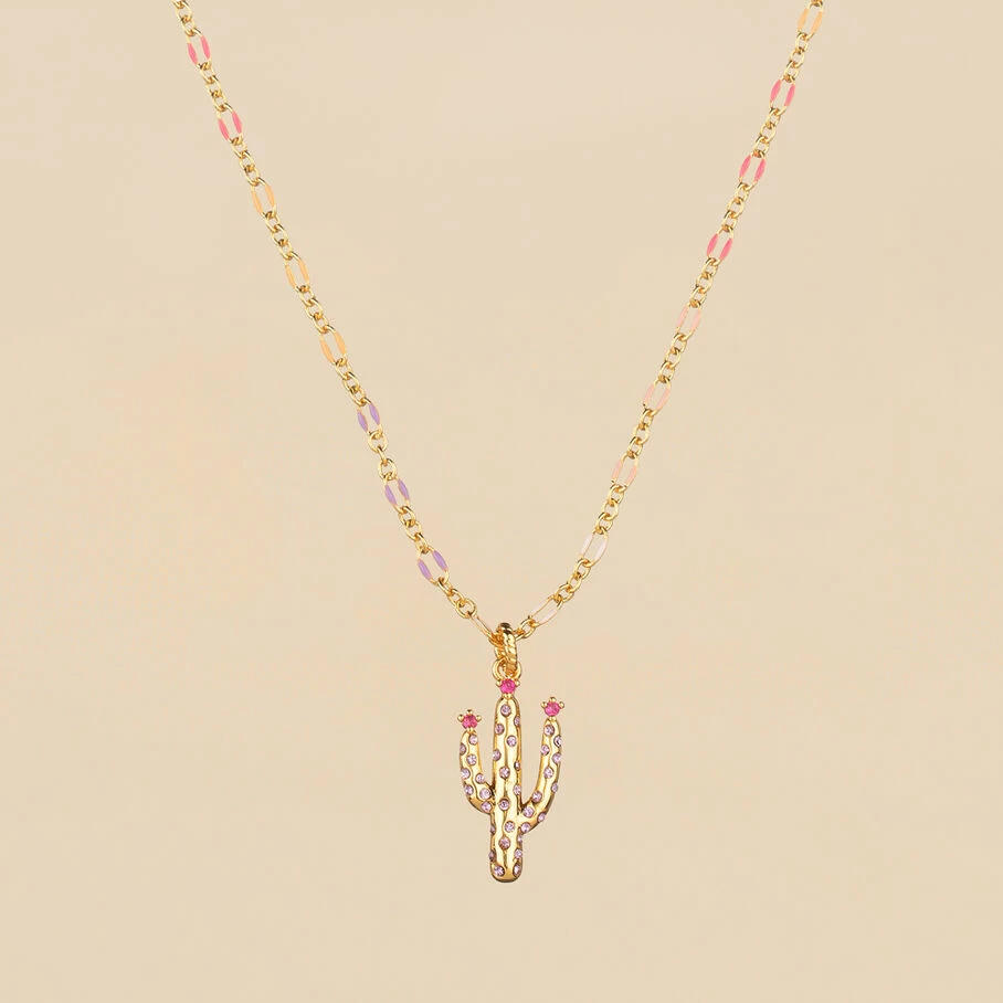 Collier court, en laiton doré 750/1000, chaine émaillée et cactus en pendentif avec 3 oxydes de zirconium