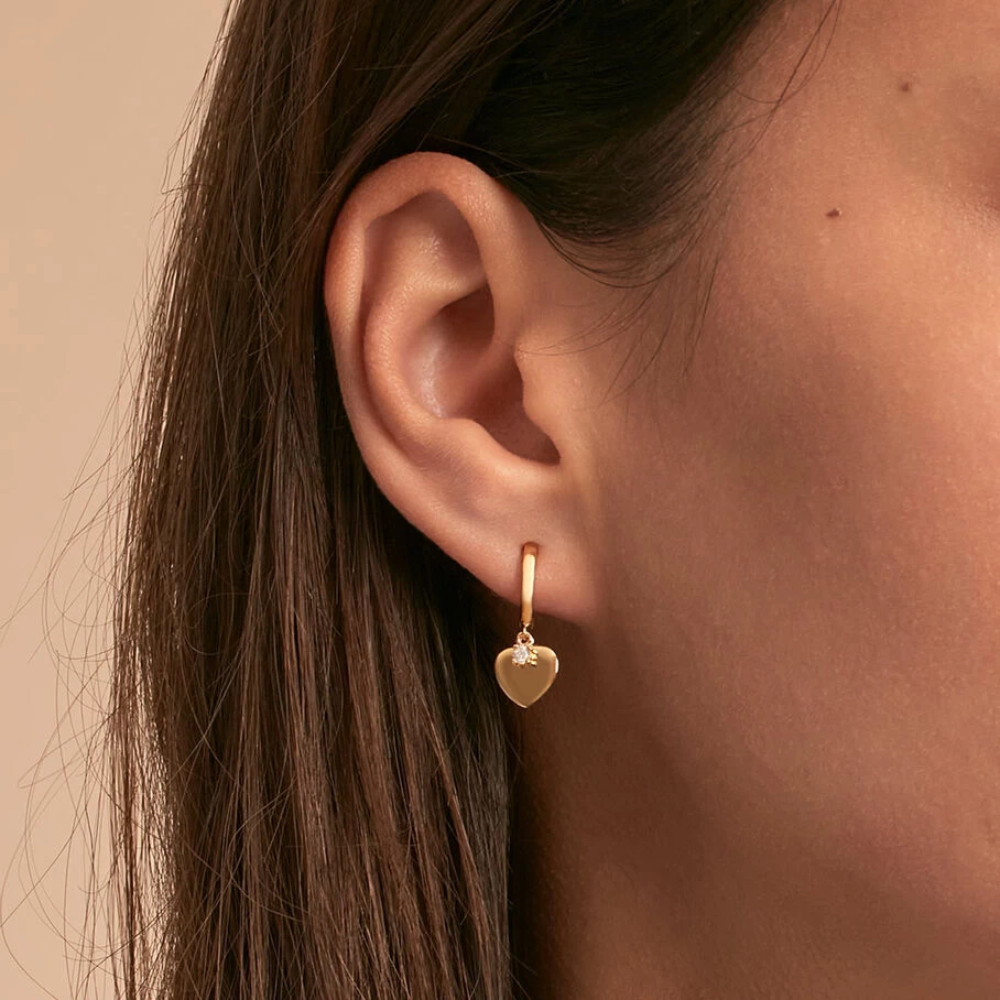 Huggies, en argent véritable doré à l’or fin, avec en breloque un pendentif coeur et un oxyde de zirconium