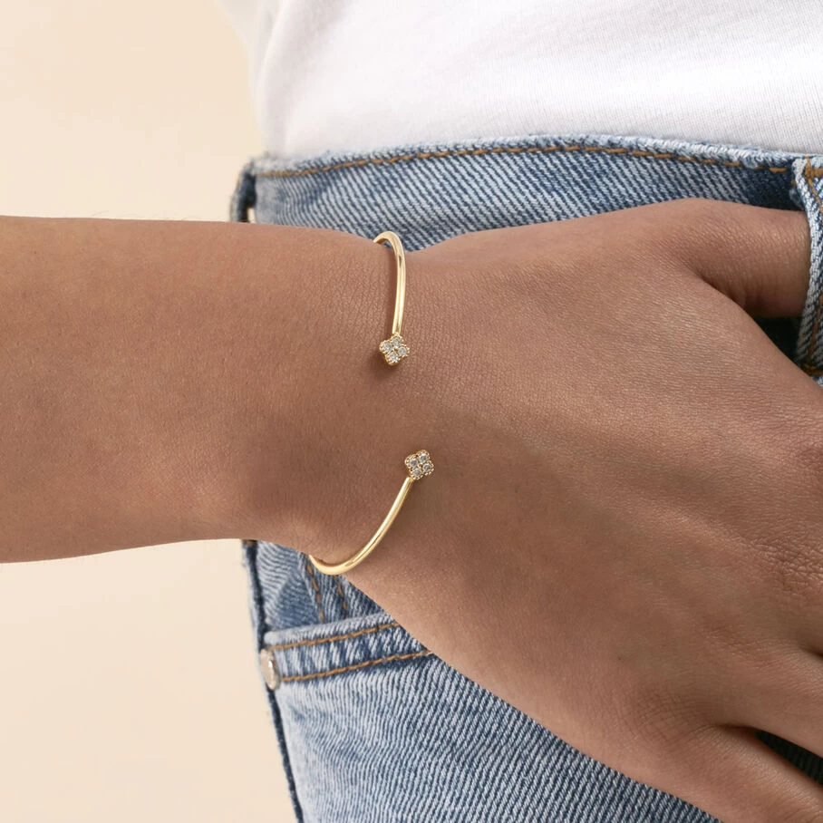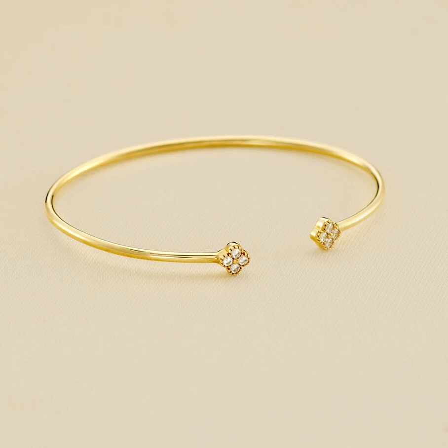 Jonc fin ouvert, en argent véritable doré 750/1000, avec des fleurs d’oxydes de zirconium aux extrémités et un fin graineti sur le pourtour