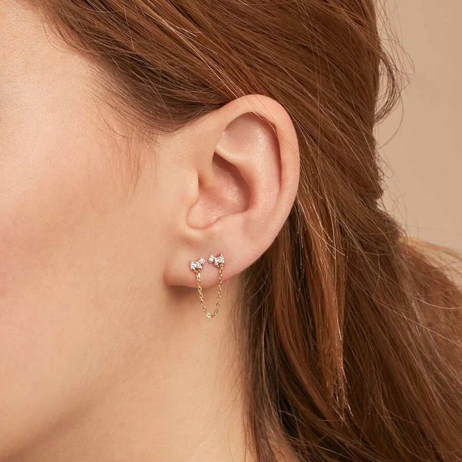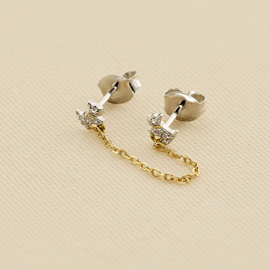 Boucle d’oreille puce, pour oreille doublement perçée, vendue à l’unité, en argent véritable doré 750/1000, ornée de deux chiens finement sertis d’oxydes de zirconium et reliés par une chaine