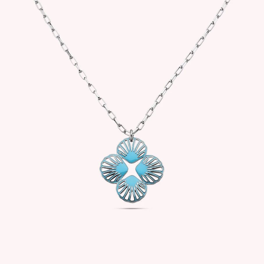 Sautoir chaîne rectangle avec un pendentif formé de quatre coquillages en trèfle. Double face: une face émaillée et une face métal.